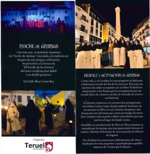 Nace con la idea de recuperar el patrimonio inmaterial y acercar las tradiciones de nuestra tierra a los más jóvenes. Dentro de la actividad se podrá escuchar el relato escrito para la ocasión, «El sonido de las ánimas», de José Baldó, vicepresidente de la Asociación Banda de Música «Santa Cecilia» de Teruel, recogido en su libro «Instrucciones para el fin del mundo», así como una representación teatral, chocolatada y queimada.